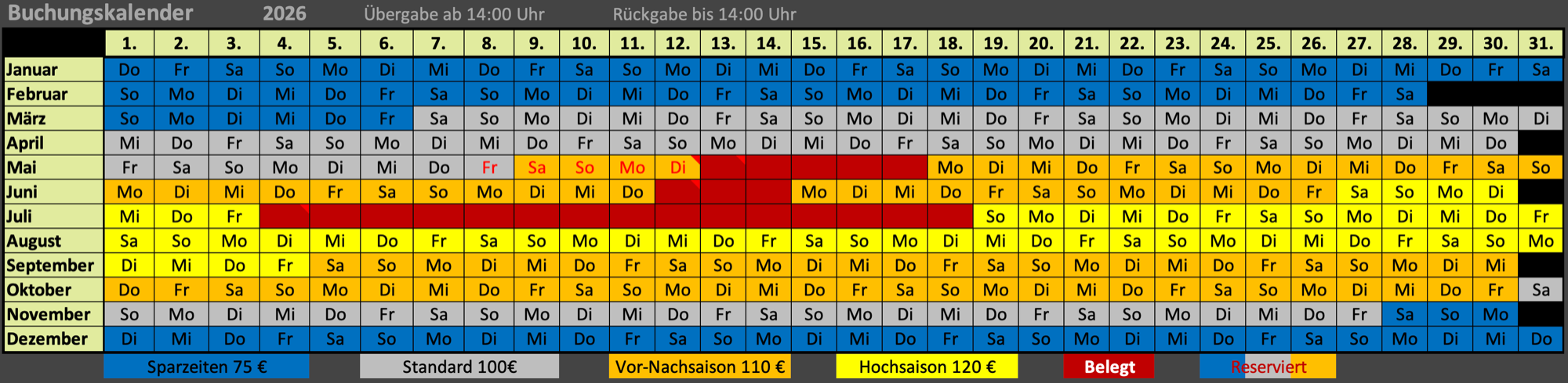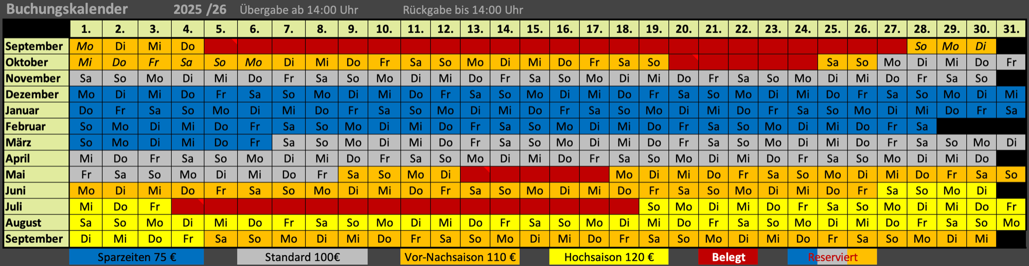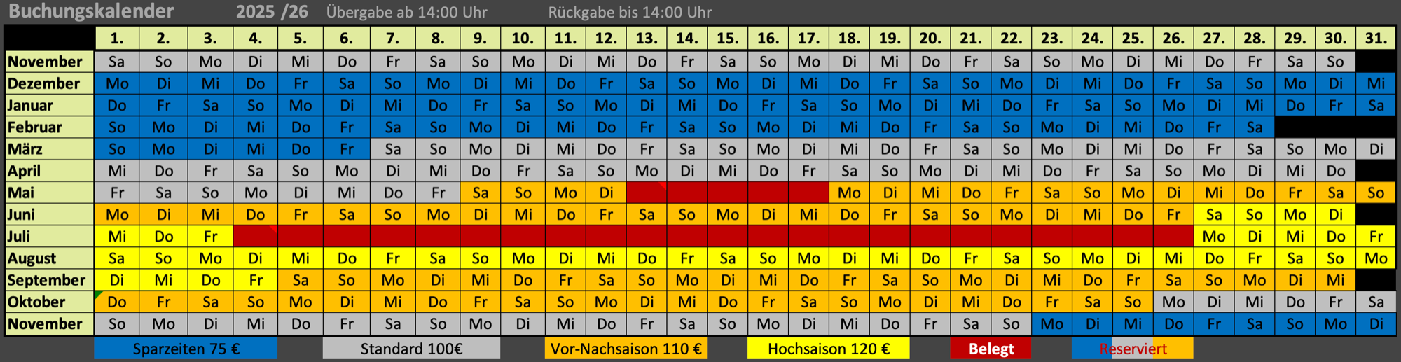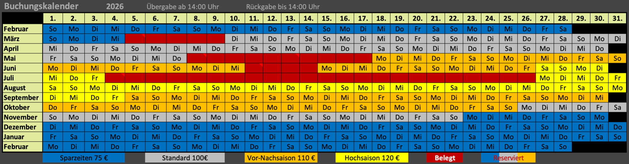 Die Mietpreise sind Saisonabhängig und richten sich auch nach der Mietdauer.